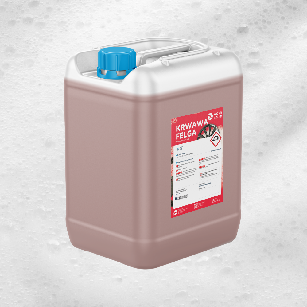 KRWAWA FELGA WASHCHEM to zasadowy preparat do mycia felg, tworzący czerwoną pianę, która rozpuszcza brud i tłuszcz bez potrzeby szczotkowania. Efektowna wizualnie, skuteczna technicznie – czysta chemia z charakterem.