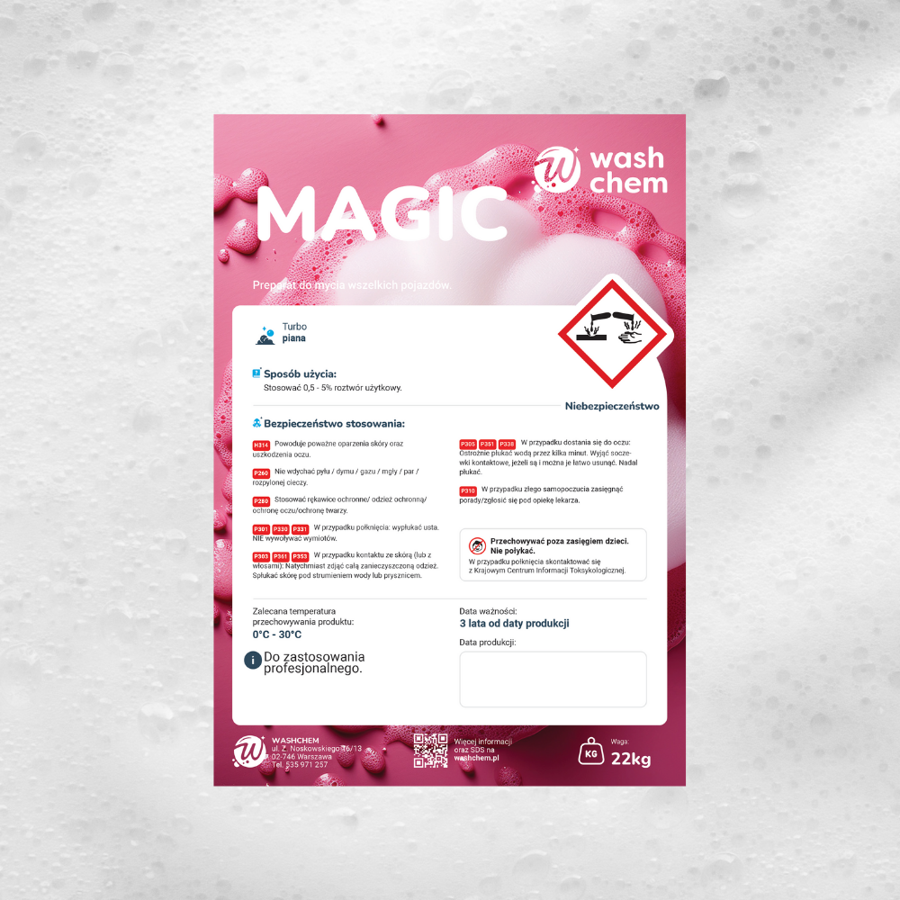 WASHCHEM MAGIC (pH 12) to różowa, niebrudząca piana aktywna, która podczas mycia stopniowo zmienia kolor z różowego na biały.