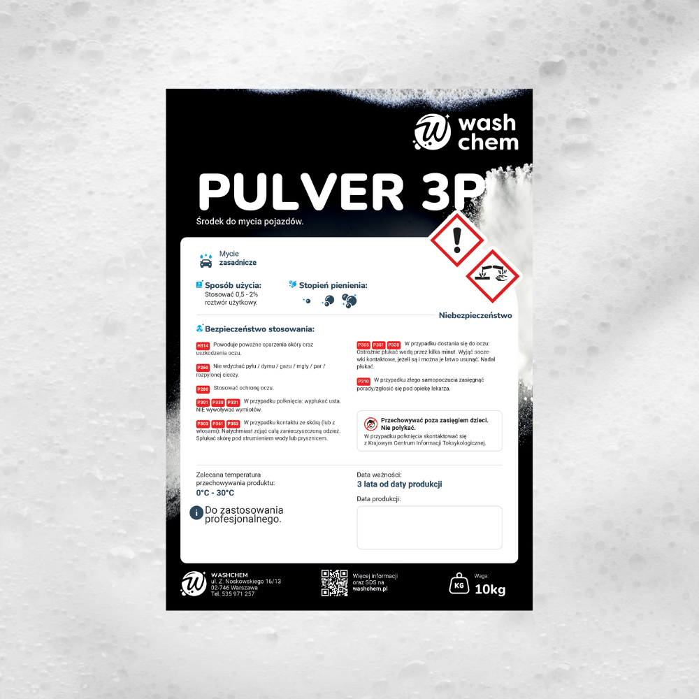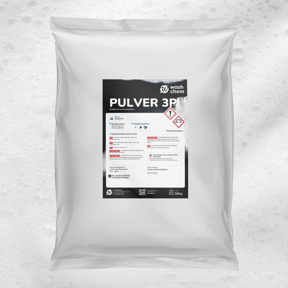 PULVER 3P to koncentrowany, pieniący się szampon proszkowy do mycia zasadniczego (pH 11), stworzony z myślą o myjniach, które chcą połączyć skuteczność chemii zasadowej z atrakcyjnym, wizualnym efektem piany.