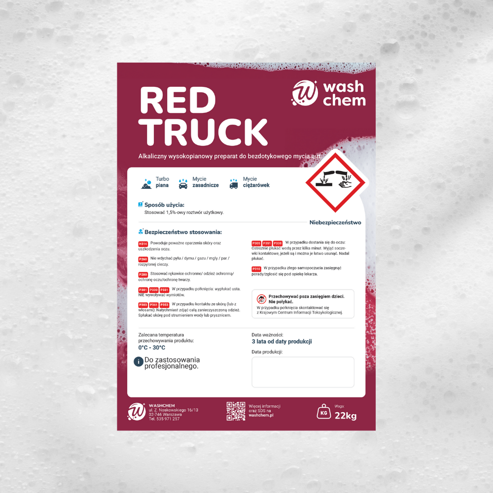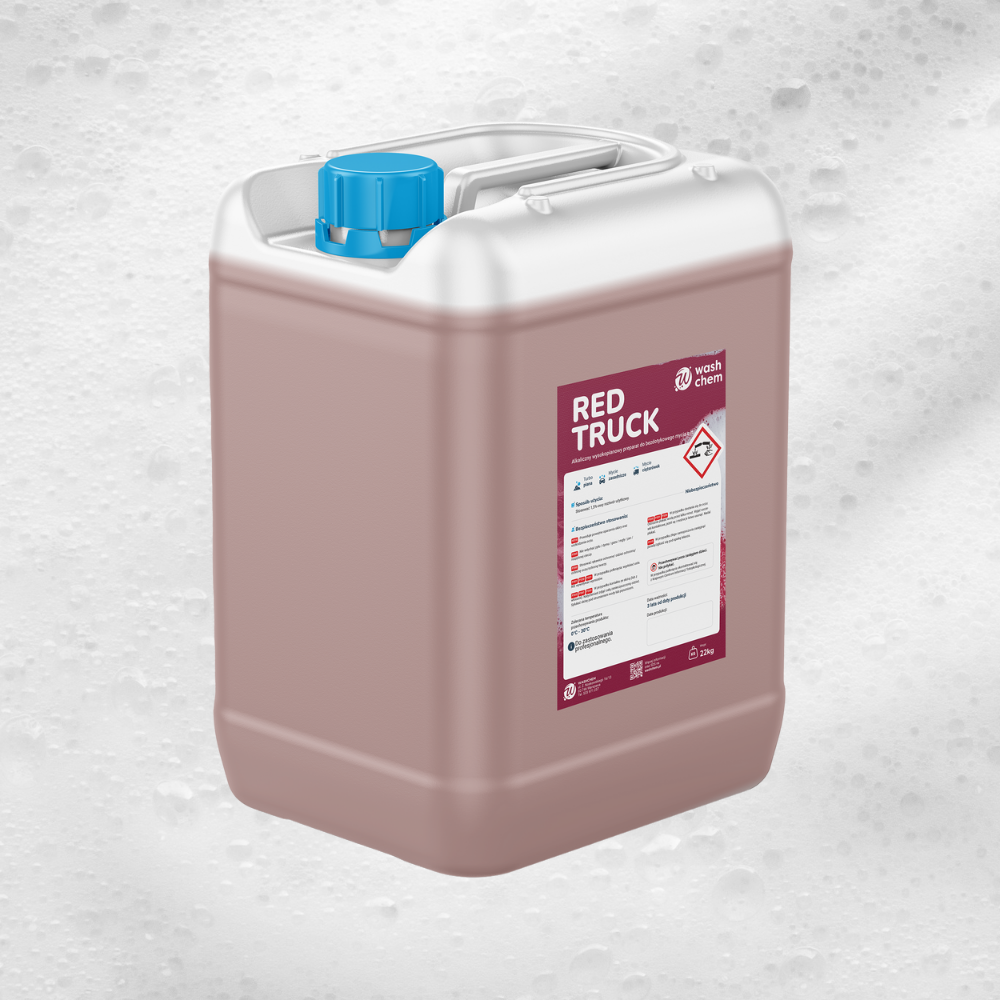 WASHCHEM RED TRUCK (pH 12) to czerwona, bezzapachowa, bardzo mocno pieniąca piana aktywna do turbo piany i programów TIR, stworzona z myślą o myjniach, które chcą dodać efektu premium bez kompromisów w skuteczności.